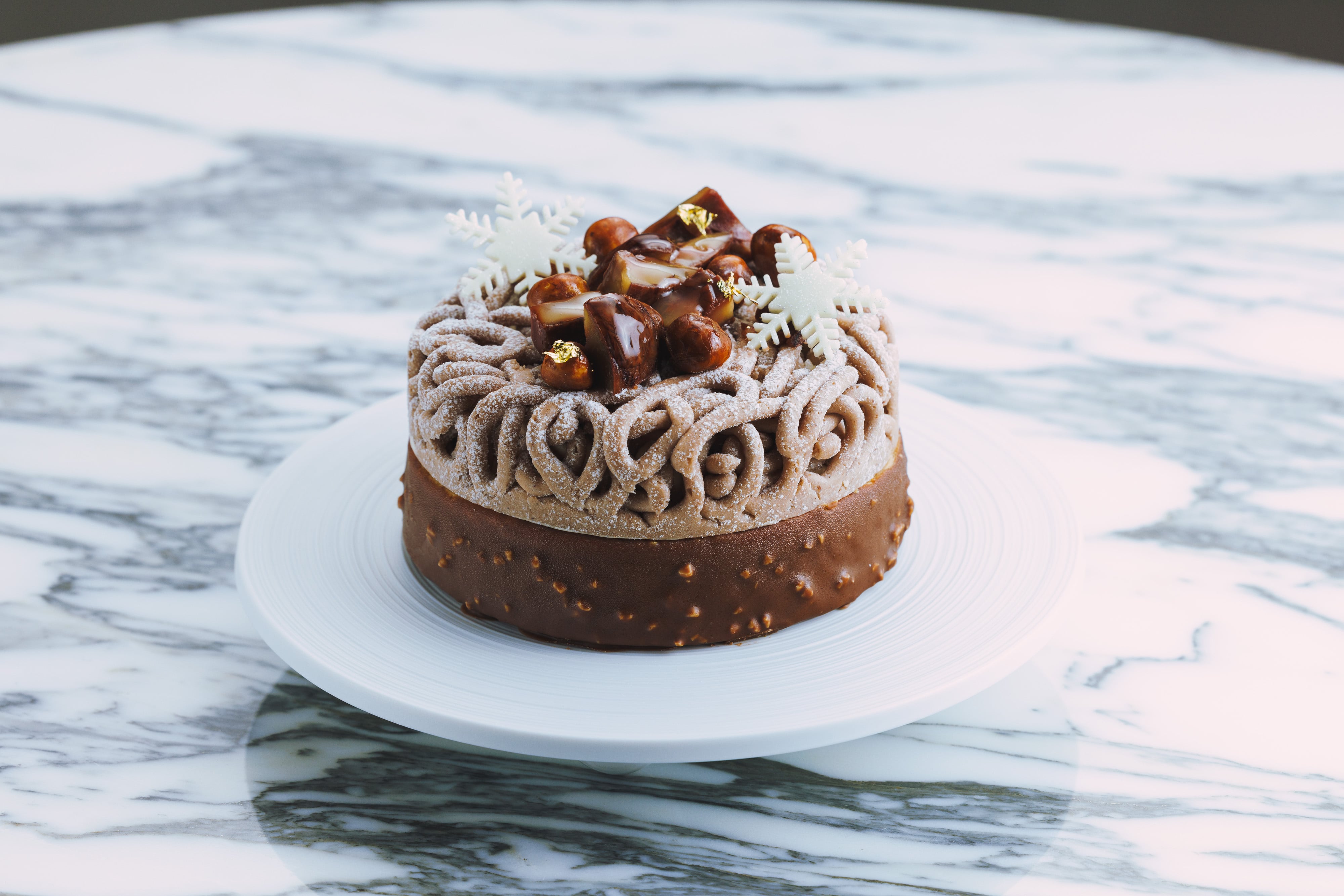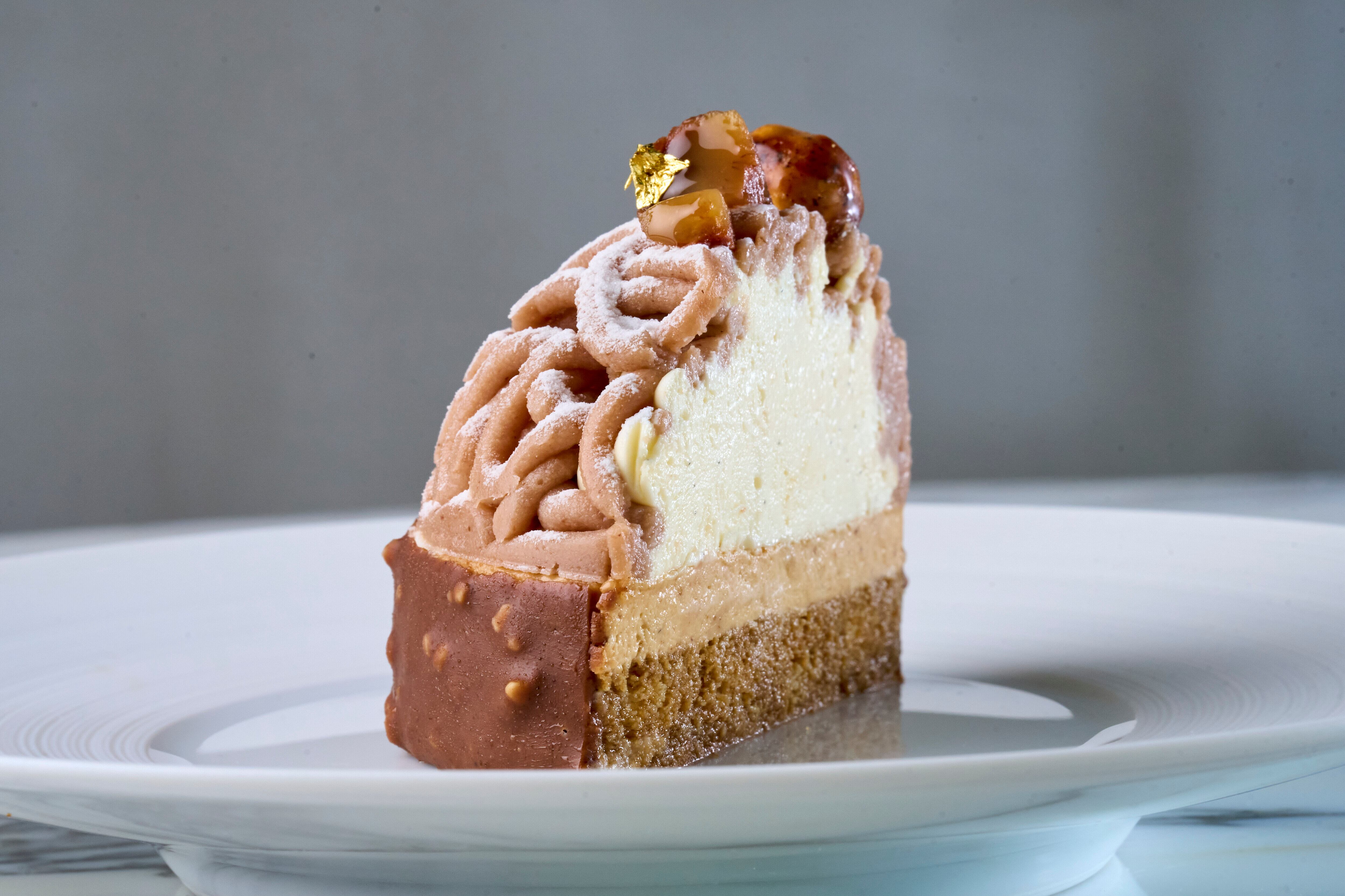 主役の濃厚なマロンクリームに合わせたのは、ふんわりクリーミーなイタリア産マスカルポーネのムース。エチオピア産のコーヒーの香りを移したシロップを染み込ませた、アーモンドパウダーを贅沢にたっぷりと使用したパンドジェンヌと、自家製ヘーゼルナッツのプラリネを混ぜ込んだ香り高いヘーゼルナッツクリームを、ヘーゼルナッツの食感をアクセントに加えたチョコレートでコーティング。